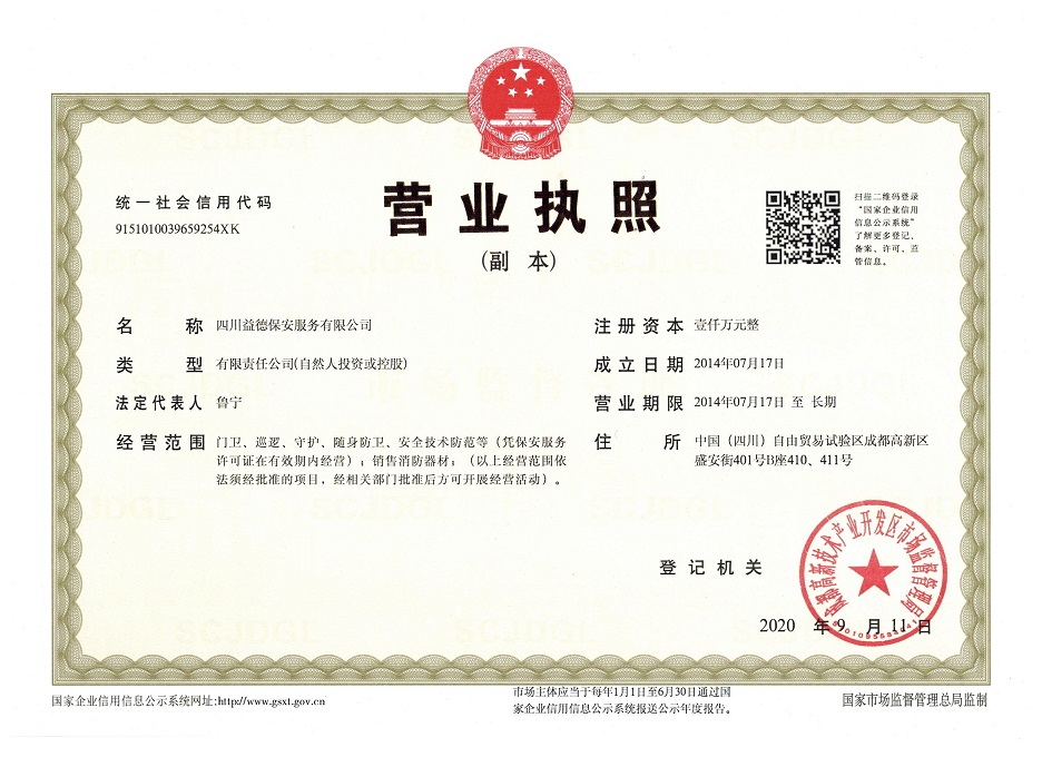 四川益德保安服务有限公司(以下简称公司)是经四川省公安厅核准颁发保安服务许可证,国家工商行政管理部门批准注册的专业安保服务企业。公司管理人员以部队转业干部、退伍军人为主,保安队员来自部队、公安战线的退役人员和各警校的学员。